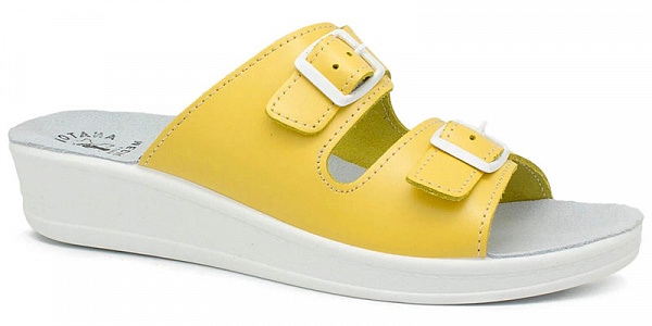 Женские анатомические пантолеты D-01 - легкая, изящная и очень удобная модель ярко-желтого цвета для повседневного ношения и долгих прогулок в теплое время года. Две надежные застежки плотно фиксируют обувь на ноге и обеспечивают полное раскрытие, позволяя легко снимать и надевать обувь.